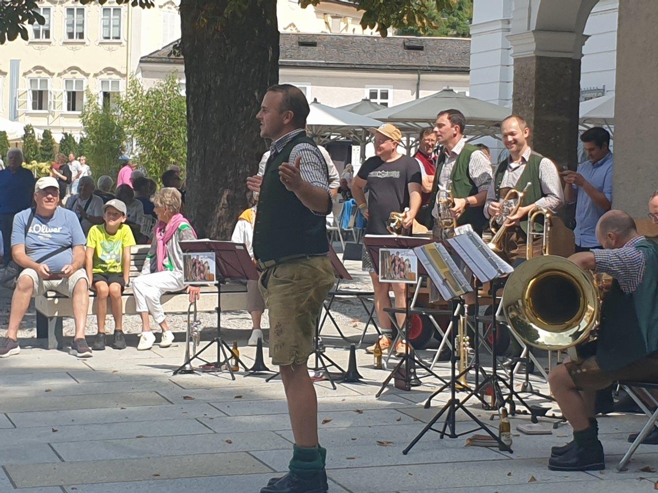 Am 24. Juli 2021 war von 12:30 Uhr bis 14:00 Uhr die Irrsberg Musi bei den Arkaden des Heimatwerks am Residenzplatz in der Salzburger Altstadt zu hören.